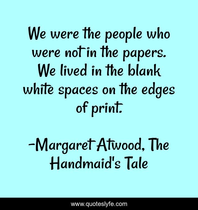 This page presents the quote "We were the people who were not in the papers. We lived in the blank white spaces on the edges of print.". Author of this quote is Margaret Atwood, The Handmaid's Tale. This quote is about oppression, books, women,.