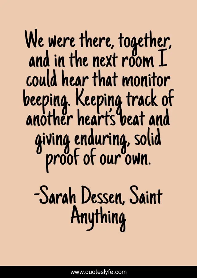 This page presents the quote "We were there, together, and in the next room I could hear that monitor beeping. Keeping track of another heart’s beat and giving enduring, solid proof of our own.". Author of this quote is Sarah Dessen, Saint Anything. This quote is about relationships, life, love, family, friendship, affection,.