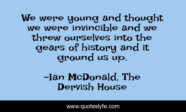 This page presents the quote "We were young and thought we were invincible and we threw ourselves into the gears of history and it ground us up.". Author of this quote is Ian McDonald, The Dervish House. This quote is about youth, invincibility, fallibility, foolishness, history,.