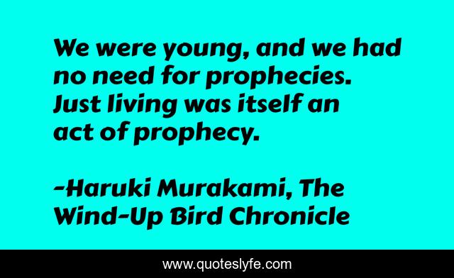 This page presents the quote "We were young, and we had no need for prophecies. Just living was itself an act of prophecy.". Author of this quote is Haruki Murakami, The Wind-Up Bird Chronicle. .