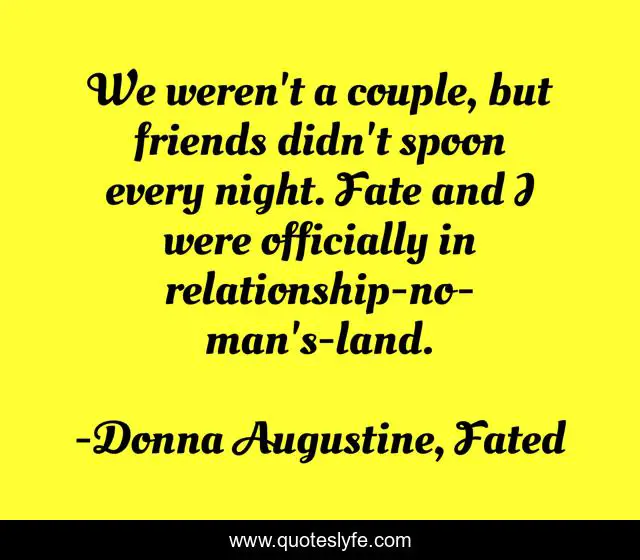 This page presents the quote "We weren't a couple, but friends didn't spoon every night. Fate and I were officially in relationship-no-man's-land.". Author of this quote is Donna Augustine, Fated. This quote is about urban-fantasy, paranormal-romance,.