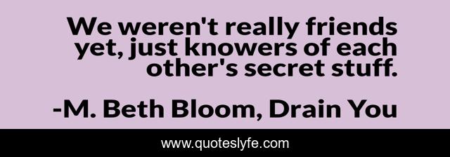 This page presents the quote "We weren't really friends yet, just knowers of each other's secret stuff.". Author of this quote is M. Beth Bloom, Drain You. This quote is about funny, friends, humor, comedy, silly,.