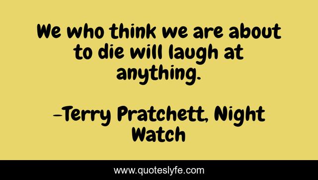 This page presents the quote "We who think we are about to die will laugh at anything.". Author of this quote is Terry Pratchett, Night Watch. This quote is about death, humor, laughing, gallows-humor,.