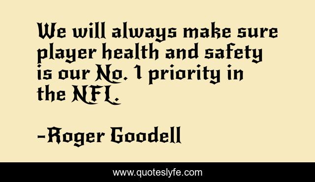 This page presents the quote "We will always make sure player health and safety is our No. 1 priority in the NFL.". Author of this quote is Roger Goodell. This quote is about always, safety,.