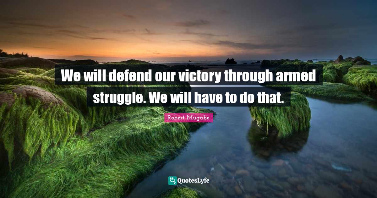 This page presents the quote "We will defend our victory through armed struggle. We will have to do that.". Author of this quote is Robert Mugabe. This quote is about struggle, armed struggle, victory,.