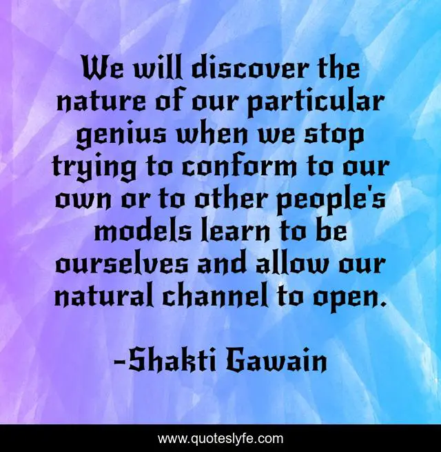 This page presents the quote "We will discover the nature of our particular genius when we stop trying to conform to our own or to other people's models learn to be ourselves and allow our natural channel to open.". Author of this quote is Shakti Gawain. .