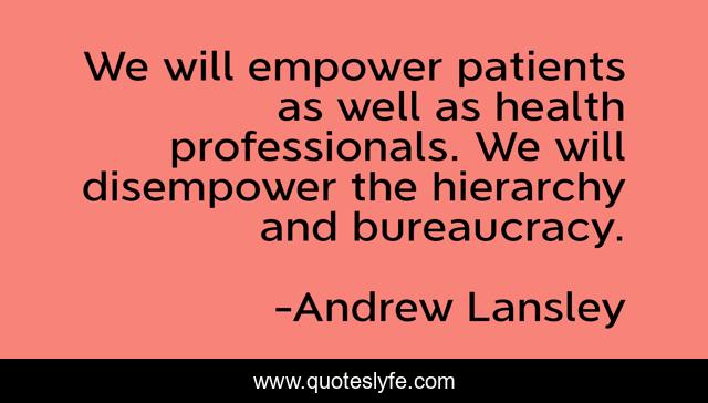 This page presents the quote "We will empower patients as well as health professionals. We will disempower the hierarchy and bureaucracy.". Author of this quote is Andrew Lansley. This quote is about bureaucracy, well,.