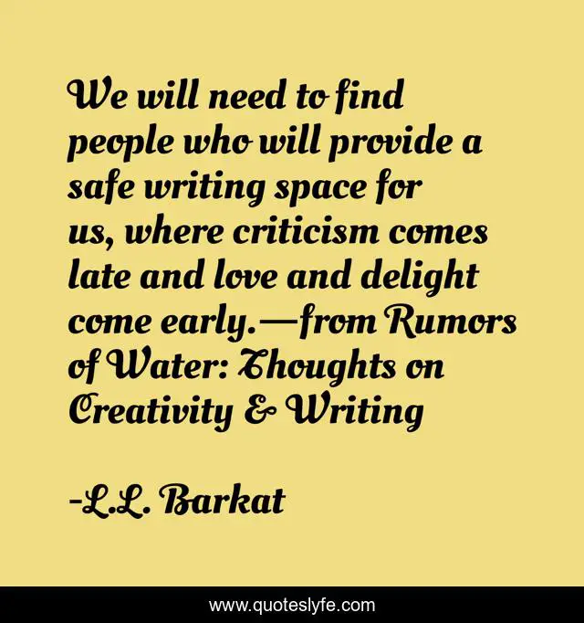 This page presents the quote "We will need to find people who will provide a safe writing space for us, where criticism comes late and love and delight come early.—from Rumors of Water: Thoughts on Creativity & Writing". Author of this quote is L.L. Barkat. This quote is about writing, writing-philosophy, writing-process, writing-advice,.