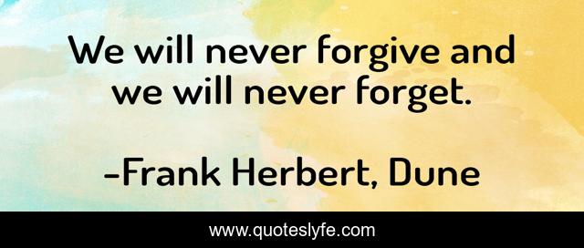 This page presents the quote "We will never forgive and we will never forget.". Author of this quote is Frank Herbert, Dune. This quote is about forget, forgive,.