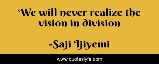 This page presents the quote "We will never realize the vision in division". Author of this quote is Saji Ijiyemi. This quote is about visionary-leader, visionary, vision-building, visions-in-life, visions, vision,.
