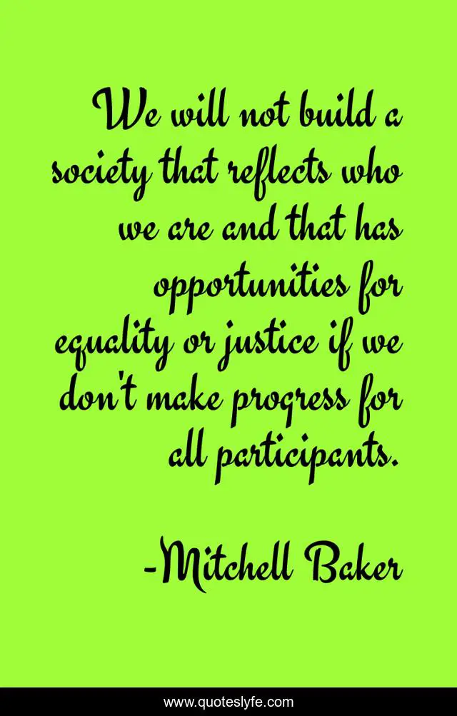 This page presents the quote "We will not build a society that reflects who we are and that has opportunities for equality or justice if we don't make progress for all participants.". Author of this quote is Mitchell Baker. This quote is about justice, progress, society,.