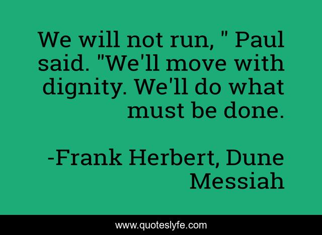 This page presents the quote "We will not run, " Paul said. "We'll move with dignity. We'll do what must be done.". Author of this quote is Frank Herbert, Dune Messiah. This quote is about dignity, paul, done, run,.