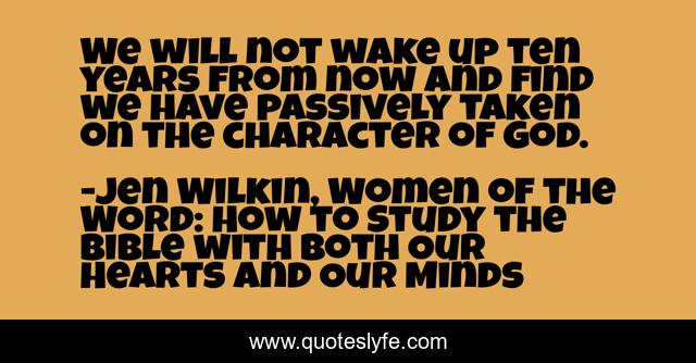 This page presents the quote "We will not wake up ten years from now and find we have passively taken on the character of God.". Author of this quote is Jen Wilkin, Women of the Word: How to Study the Bible with Both Our Hearts and Our Minds. This quote is about god, self, character,.