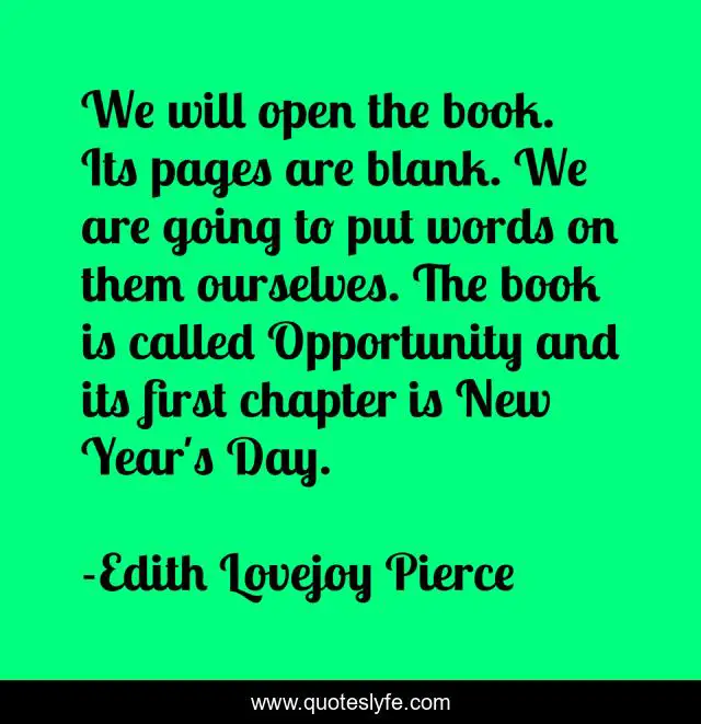 This page presents the quote "We will open the book. Its pages are blank. We are going to put words on them ourselves. The book is called Opportunity and its first chapter is New Year's Day.". Author of this quote is Edith Lovejoy Pierce. This quote is about new-year, opportunity,.