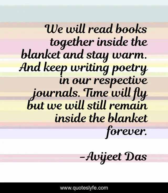 This page presents the quote "We will read books together inside the blanket and stay warm. And keep writing poetry in our respective journals. Time will fly but we will still remain inside the blanket forever.". Author of this quote is Avijeet Das. This quote is about writers-on-writing, love-poetry, journal, love-poems, poets-and-poetry, poetry-life, warm, books, writers,.