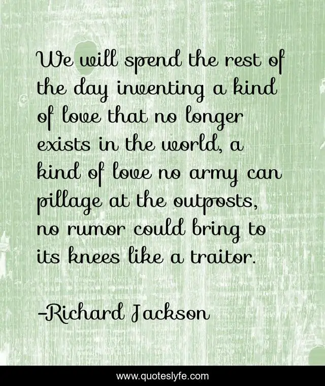 This page presents the quote "We will spend the rest of the day inventing a kind of love that no longer exists in the world, a kind of love no army can pillage at the outposts, no rumor could bring to its knees like a traitor.". Author of this quote is Richard Jackson. This quote is about love, poetry, affection,.