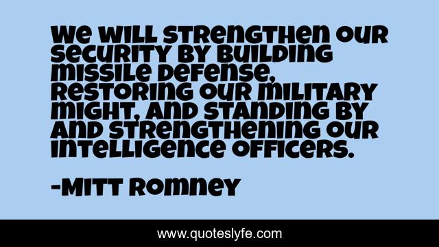 This page presents the quote "We will strengthen our security by building missile defense, restoring our military might, and standing by and strengthening our intelligence officers.". Author of this quote is Mitt Romney. This quote is about building, military, security,.