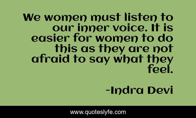 This page presents the quote "We women must listen to our inner voice. It is easier for women to do this as they are not afraid to say what they feel.". Author of this quote is Indra Devi. This quote is about voice, listen,.