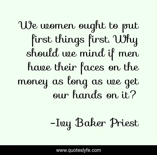 This page presents the quote "We women ought to put first things first. Why should we mind if men have their faces on the money as long as we get our hands on it?". Author of this quote is Ivy Baker Priest. .