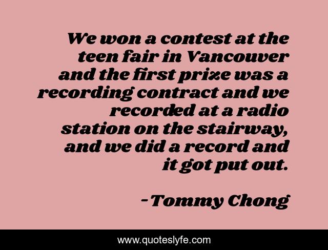 This page presents the quote "We won a contest at the teen fair in Vancouver and the first prize was a recording contract and we recorded at a radio station on the stairway, and we did a record and it got put out.". Author of this quote is Tommy Chong. This quote is about radio, fair, first,.