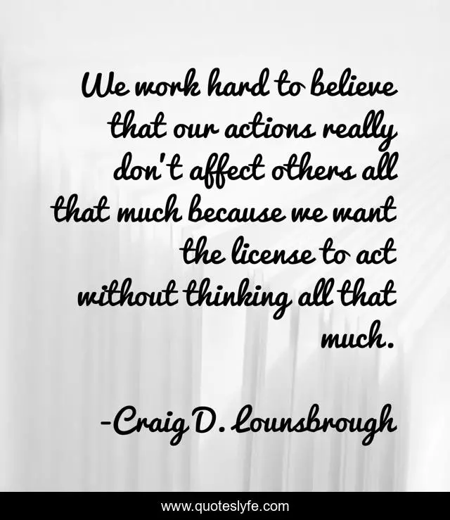 This page presents the quote "We work hard to believe that our actions really don’t affect others all that much because we want the license to act without thinking all that much.". Author of this quote is Craig D. Lounsbrough. This quote is about license, denial, belief, consequences, permission, freedom, repercussions, ignorance, actions,.