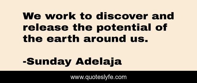 This page presents the quote "We work to discover and release the potential of the earth around us.". Author of this quote is Sunday Adelaja. This quote is about release, potential, work, discovery,.