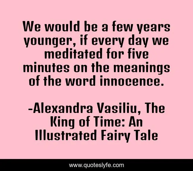 This page presents the quote "We would be a few years younger, if every day we meditated for five minutes on the meanings of the word innocence.". Author of this quote is Alexandra Vasiliu, The King of Time: An Illustrated Fairy Tale. This quote is about inspiarational, innocence,.