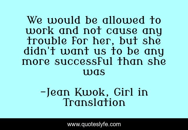 This page presents the quote "We would be allowed to work and not cause any trouble for her, but she didn't want us to be any more successful than she was". Author of this quote is Jean Kwok, Girl in Translation. .