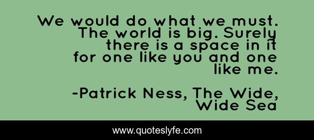 This page presents the quote "We would do what we must. The world is big. Surely there is a space in it for one like you and one like me.". Author of this quote is Patrick Ness, The Wide, Wide Sea. This quote is about world, spackle, place, space,.