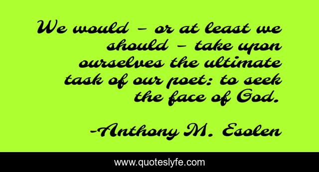 This page presents the quote "We would – or at least we should – take upon ourselves the ultimate task of our poet: to seek the face of God.". Author of this quote is Anthony M. Esolen. This quote is about mysticism, intimacy-with-god, art, poetry,.