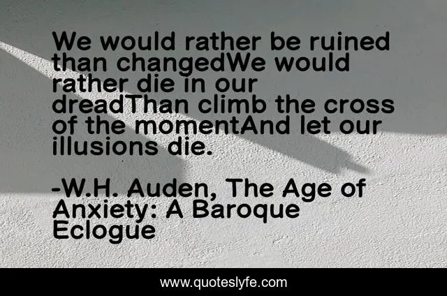 This page presents the quote "We would rather be ruined than changedWe would rather die in our dreadThan climb the cross of the momentAnd let our illusions die.". Author of this quote is W.H. Auden, The Age of Anxiety: A Baroque Eclogue. This quote is about fear, poetry, change,.