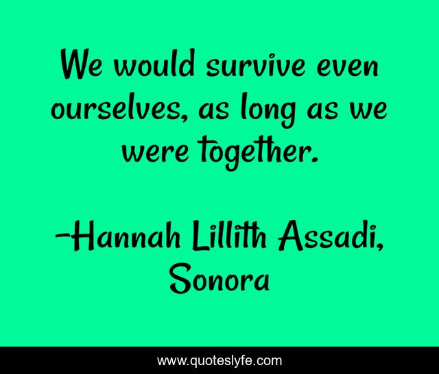 This page presents the quote "We would survive even ourselves, as long as we were together.". Author of this quote is Hannah Lillith Assadi, Sonora. This quote is about self-destruction, survival, hannah-lillith-assadi, sonora, together,.