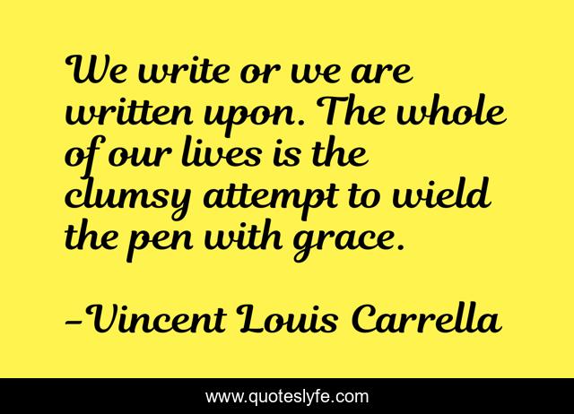 This page presents the quote "We write or we are written upon. The whole of our lives is the clumsy attempt to wield the pen with grace.". Author of this quote is Vincent Louis Carrella. This quote is about action, pens, grace, volition, writing,.