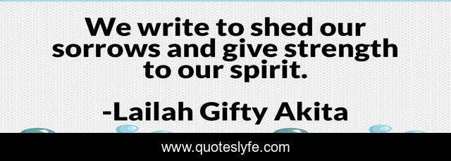This page presents the quote "We write to shed our sorrows and give strength to our spirit.". Author of this quote is Lailah Gifty Akita. This quote is about sorrows, confidence, lailah-gifty-akita-affirmations, sufferings, positive, motivational, writing-life, write, tears,.