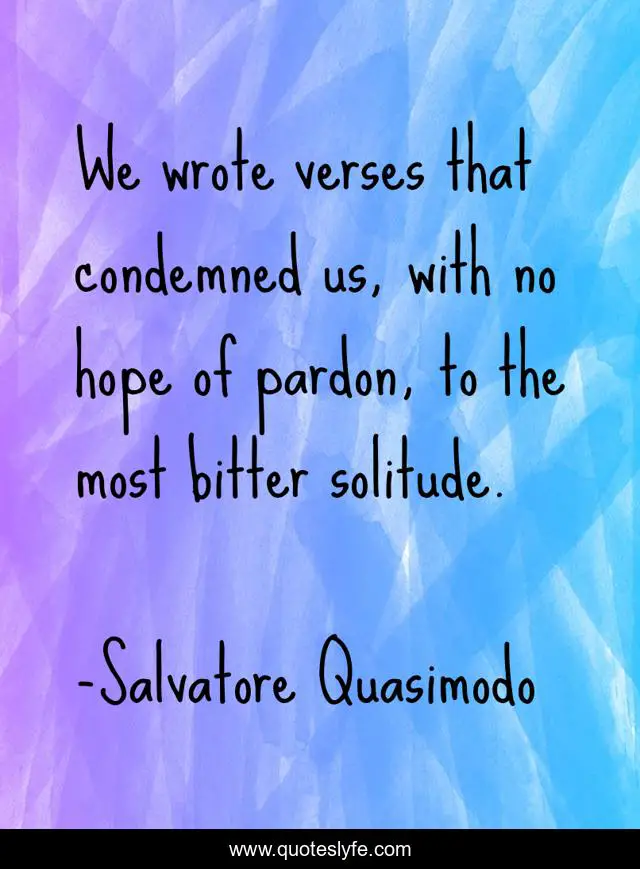 This page presents the quote "We wrote verses that condemned us, with no hope of pardon, to the most bitter solitude.". Author of this quote is Salvatore Quasimodo. This quote is about solitude, bitter, us,.