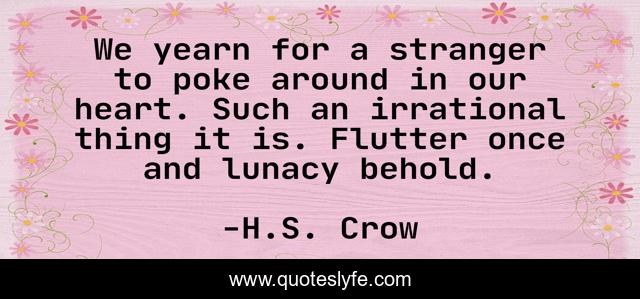 This page presents the quote "We yearn for a stranger to poke around in our heart. Such an irrational thing it is. Flutter once and lunacy behold.". Author of this quote is H.S. Crow. This quote is about humor, crazy-love, madness, love, affection,.