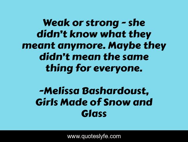 This page presents the quote "Weak or strong - she didn’t know what they meant anymore. Maybe they didn’t mean the same thing for everyone.". Author of this quote is Melissa Bashardoust, Girls Made of Snow and Glass. .