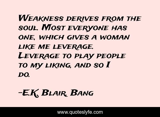 This page presents the quote "Weakness derives from the soul. Most everyone has one, which gives a woman like me leverage. Leverage to play people to my liking, and so I do.". Author of this quote is E.K. Blair, Bang. .