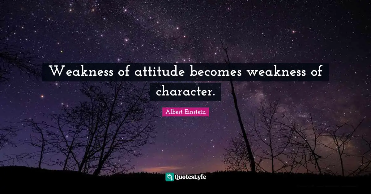 This page presents the quote "Weakness of attitude becomes weakness of character.". Author of this quote is Albert Einstein. This quote is about weakness, character, becomes,.