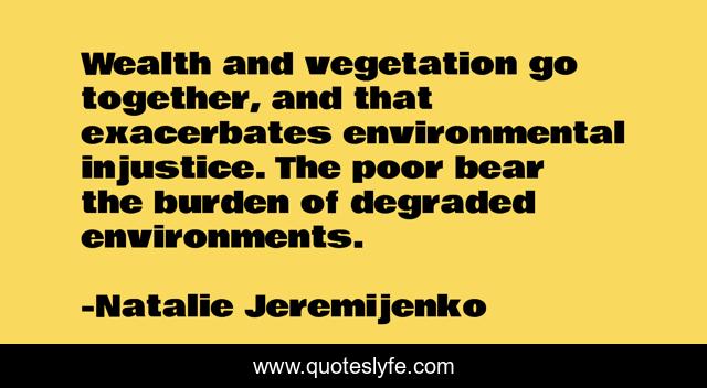 This page presents the quote "Wealth and vegetation go together, and that exacerbates environmental injustice. The poor bear the burden of degraded environments.". Author of this quote is Natalie Jeremijenko. This quote is about injustice, together, wealth,.