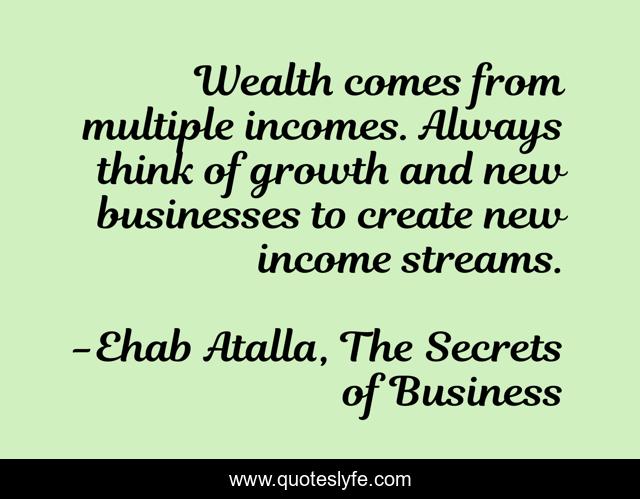 This page presents the quote "Wealth comes from multiple incomes. Always think of growth and new businesses to create new income streams.". Author of this quote is Ehab Atalla, The Secrets of Business. This quote is about business, entrepreneurship,.