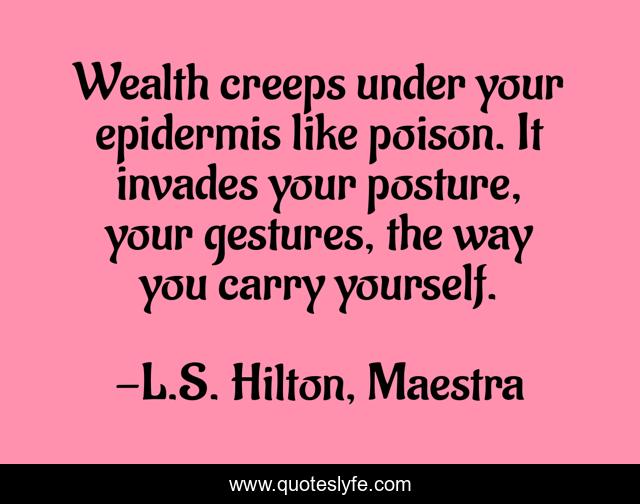 This page presents the quote "Wealth creeps under your epidermis like poison. It invades your posture, your gestures, the way you carry yourself.". Author of this quote is L.S. Hilton, Maestra. .