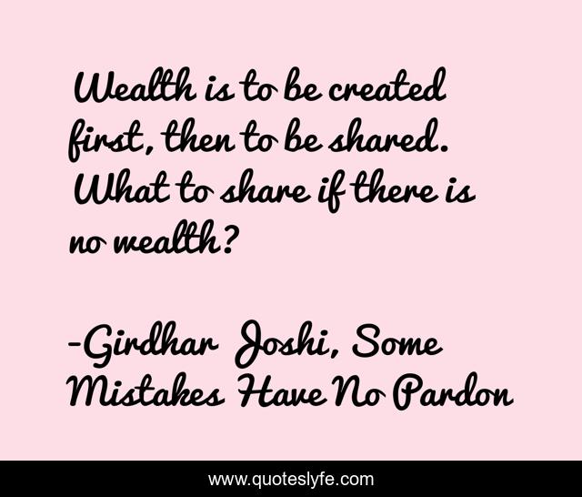This page presents the quote "Wealth is to be created first, then to be shared. What to share if there is no wealth?". Author of this quote is Girdhar Joshi, Some Mistakes Have No Pardon. This quote is about share, wealth,.