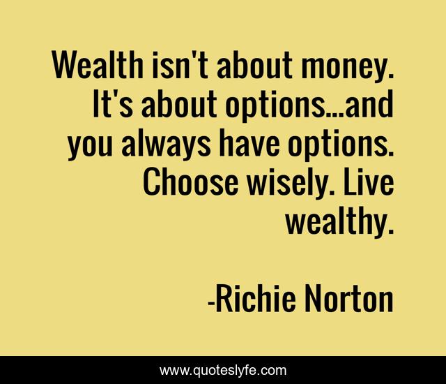 This page presents the quote "Wealth isn't about money. It's about options...and you always have options. Choose wisely. Live wealthy.". Author of this quote is Richie Norton. This quote is about college-student, wise, wealth, money, agency, startup, life, free, choice,.