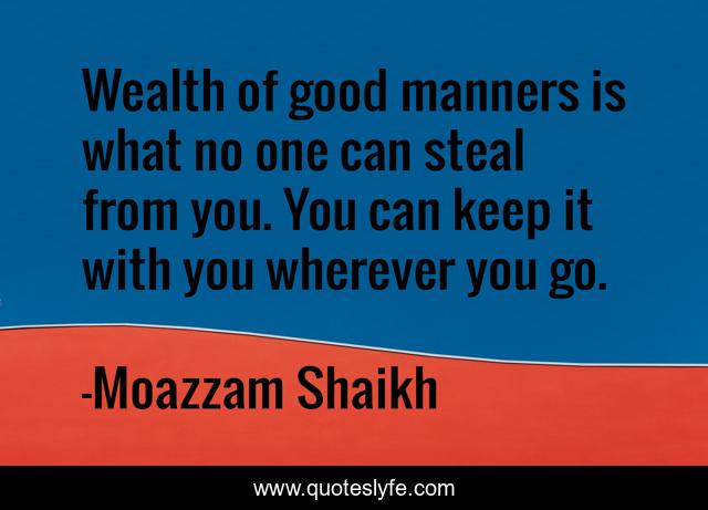 This page presents the quote "Wealth of good manners is what no one can steal from you. You can keep it with you wherever you go.". Author of this quote is Moazzam Shaikh. This quote is about manners, wealth,.