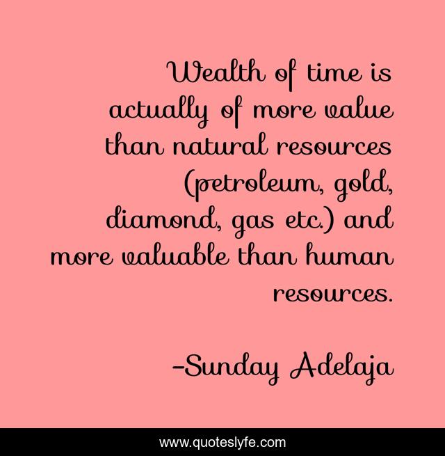 This page presents the quote "Wealth of time is actually of more value than natural resources (petroleum, gold, diamond, gas etc.) and more valuable than human resources.". Author of this quote is Sunday Adelaja. This quote is about diamond, natural, wealth, gold, petroleum, gas, valuable, times, human,.