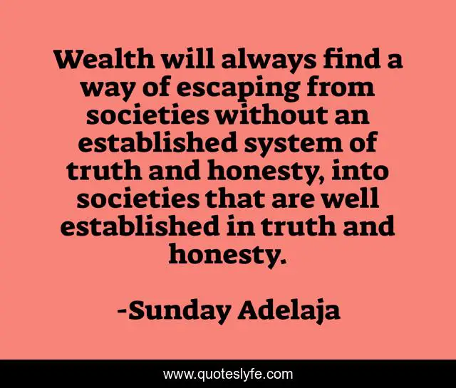 This page presents the quote "Wealth will always find a way of escaping from societies without an established system of truth and honesty, into societies that are well established in truth and honesty.". Author of this quote is Sunday Adelaja. This quote is about system, society, wealth, truth, honesty,.