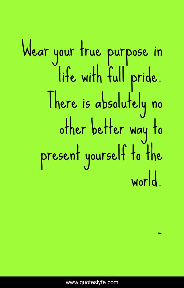 This page presents the quote "Wear your true purpose in life with full pride. There is absolutely no other better way to present yourself to the world.". Author of this quote is . This quote is about edmond-mbiaka, show-the-world-your-true-purpose, your-positive-purpose, your-true-purpose-in-life,.