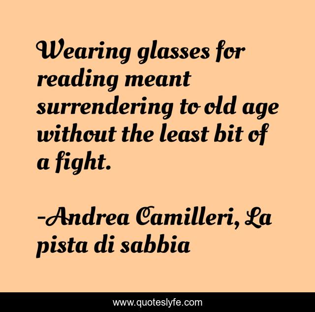 This page presents the quote "Wearing glasses for reading meant surrendering to old age without the least bit of a fight.". Author of this quote is Andrea Camilleri, La pista di sabbia. This quote is about aging, humor,.