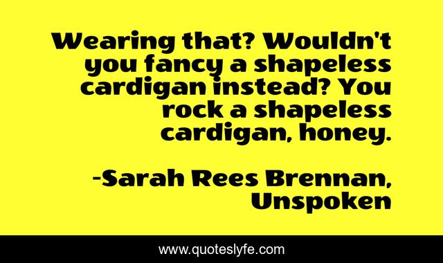 This page presents the quote "Wearing that? Wouldn't you fancy a shapeless cardigan instead? You rock a shapeless cardigan, honey.". Author of this quote is Sarah Rees Brennan, Unspoken. This quote is about dad, cute, humor, endearing,.